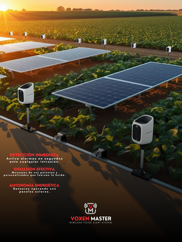 VoxenMaster es un sistema de seguridad inalámbrico disuasivo autónomo que redefine la forma de proteger predios agrícolas, instalaciones industriales, obras de construcción, centros logísticos, bodegas mineras, automotoras, casas patronales y centros comerciales. Utilizando sensores inalámbricos de alta precisión, altavoces de voz disuasiva y energía solar, VoxenMaster actúa en segundos ante una amenaza, sin depender de monitoreo constante ni grabaciones pasivas.